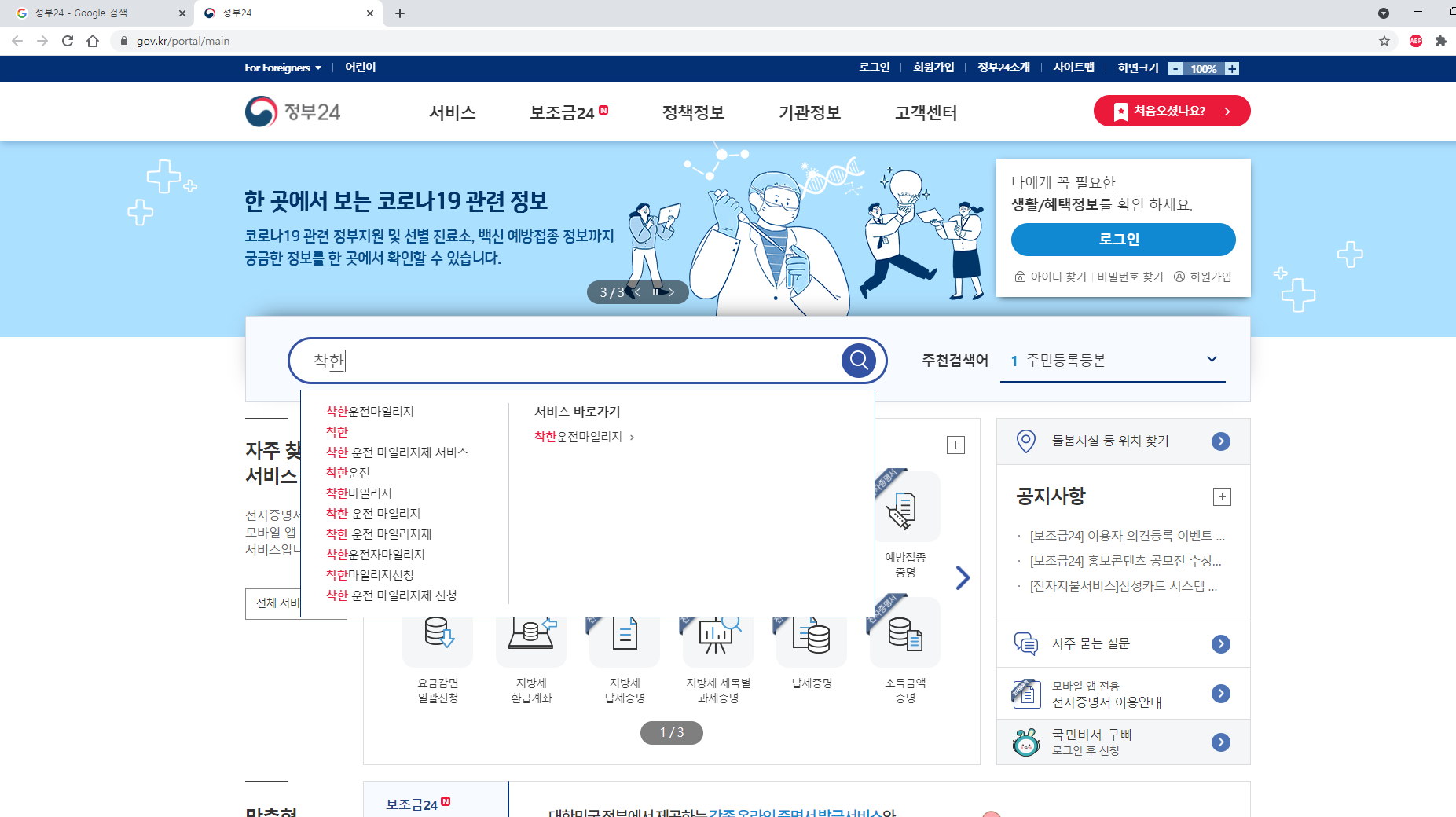 홈페이지에서 가운데 검색창에서 착한 운전 마일리지를 검색합니다.