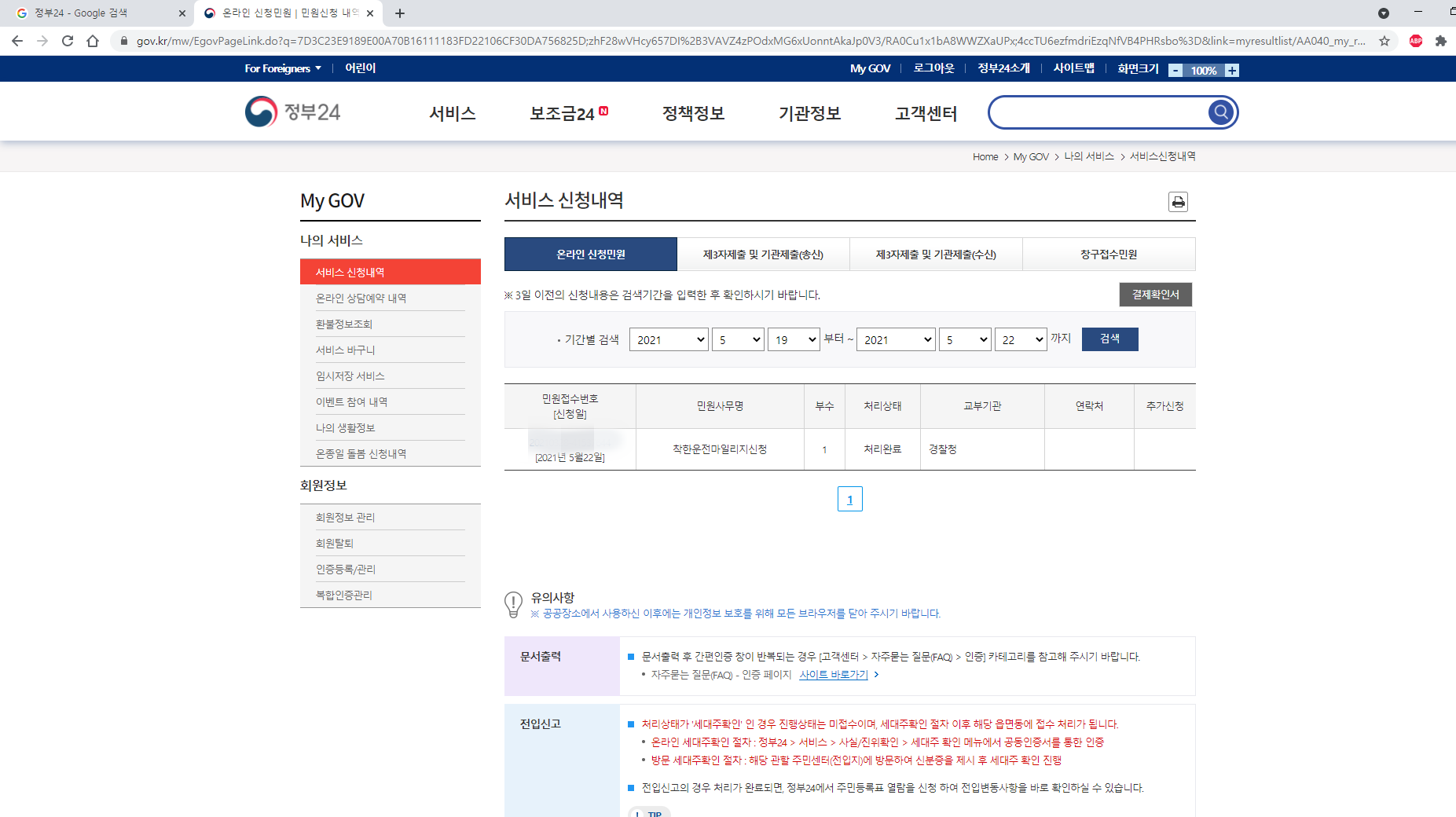 처리가 완료되면 신청내역을 확인 가능합니다.
