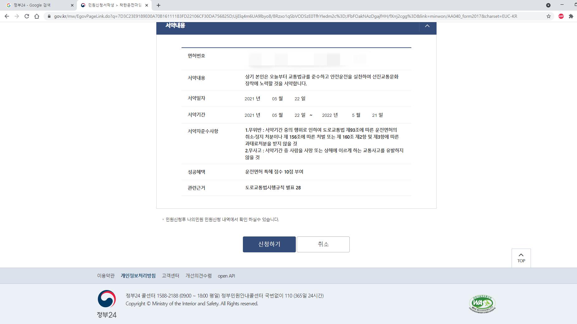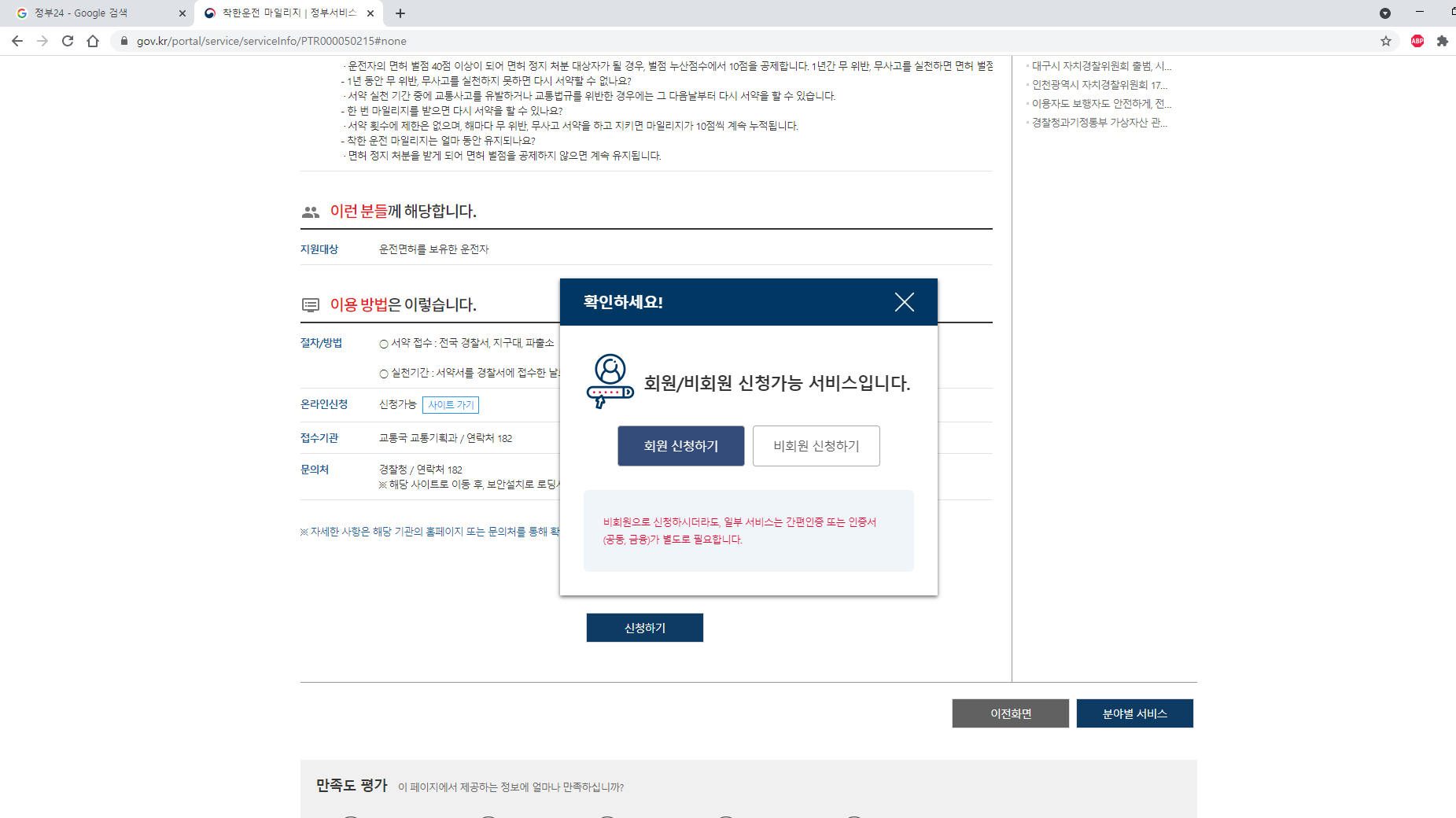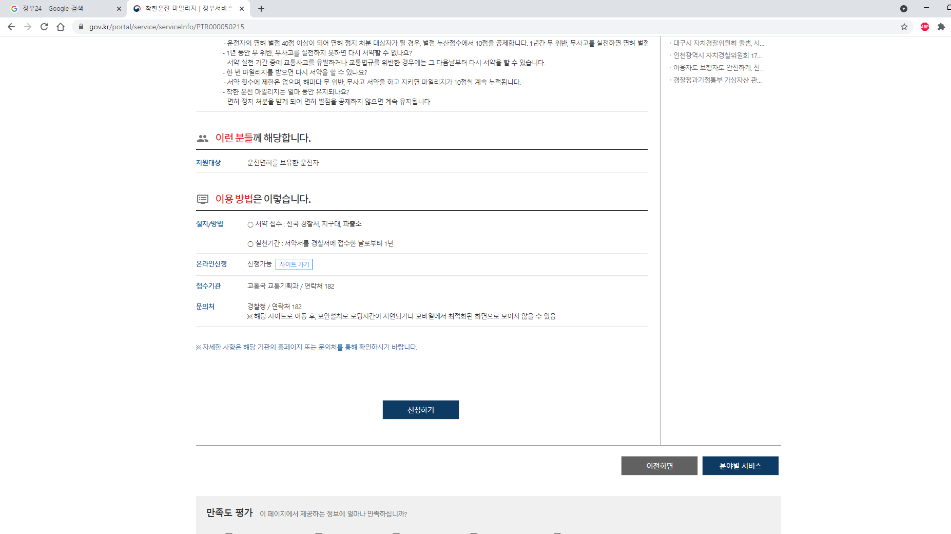 위의 순서대로 진행하시면 경찰서에 방문하지 않고도 손쉽게 인터넷으로 착한 운전 마일리지를 신청할 수 있습니다.