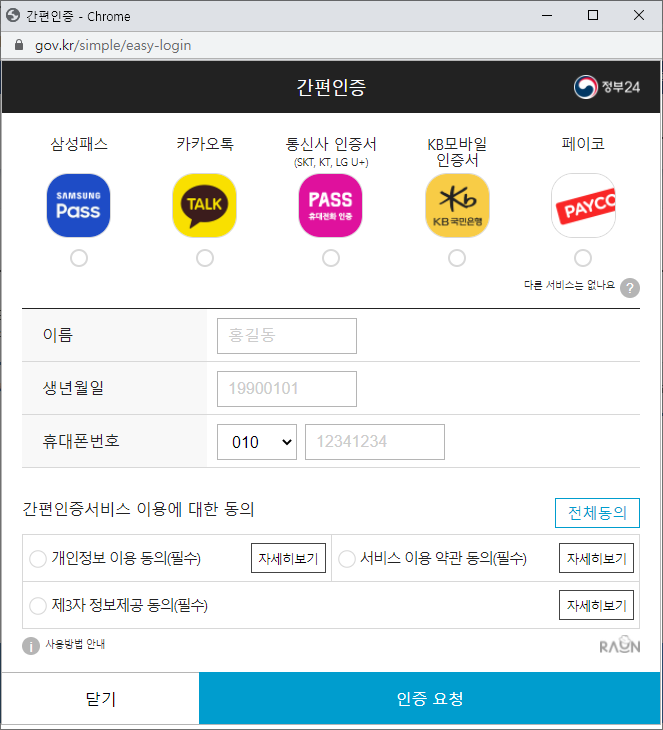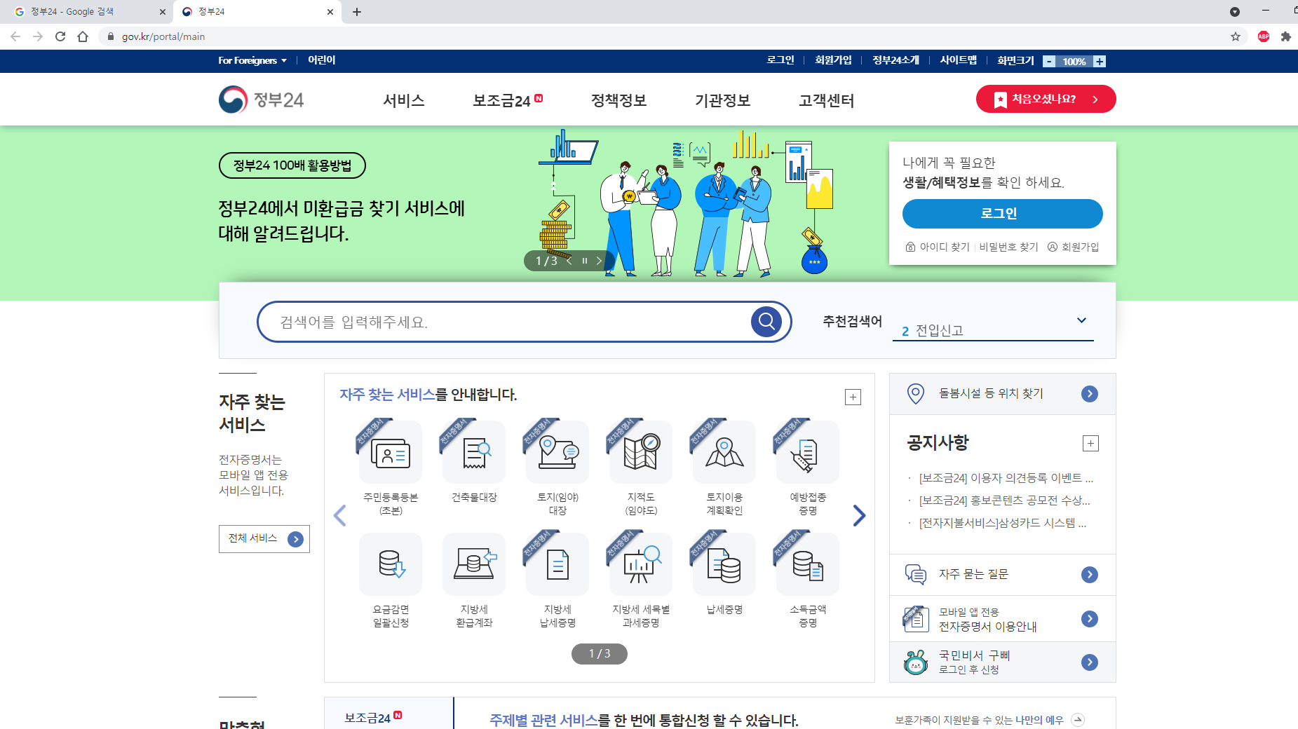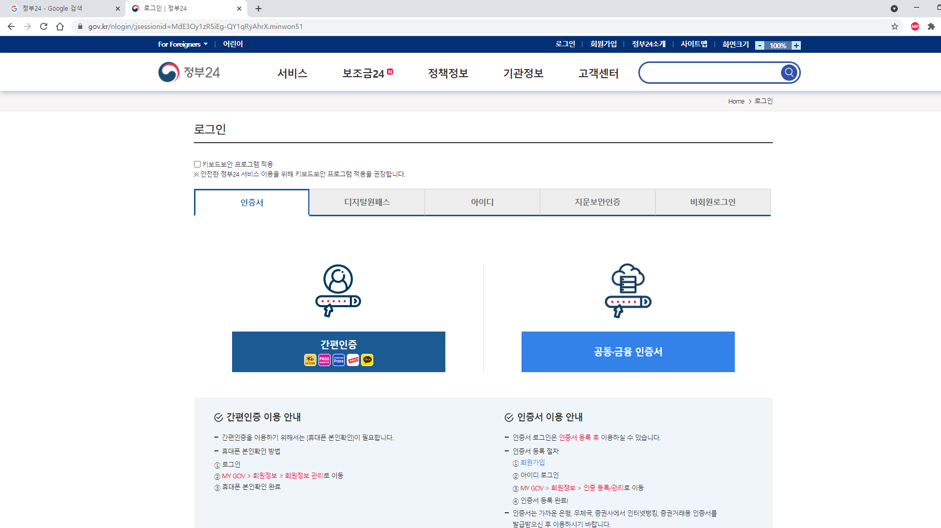 공동 인증서(구 공인인증서)가 있으면 공동 인증서를 사용해 로그인하여도 되고 아이디와 비밀번호를 입력하여 로그인하여도 됩니다. 현재는 간편 인증이 잘 되어있으므로 간편 인증을 이용해 로그인하는 것을 권장드립니다.