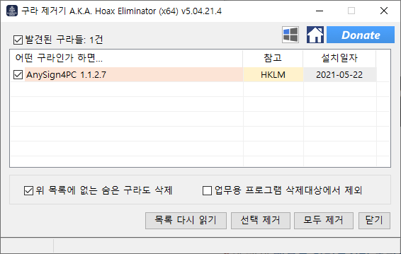 이런 식으로 설치한 프로그램이 검색이 됩니다. 모두 제거를 눌러 삭제하면 됩니다.
