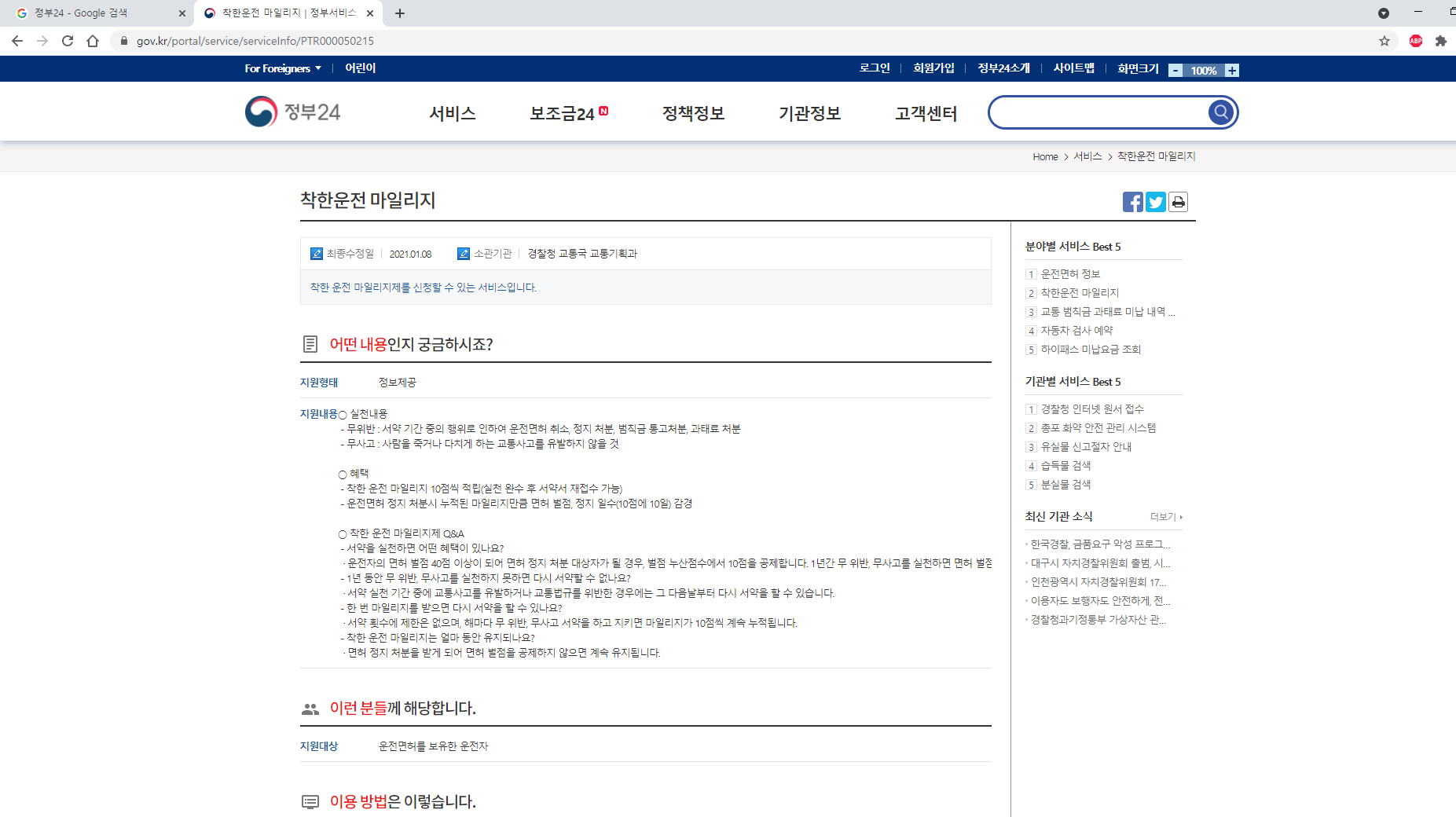 착한 운전 마일리지는 운전 중 교통사고를 일으키거나 도로교통법을 위반하지 않는다는 계약을 정부와 함으로써 대신 정부에서 1년에 10 마일리지를 제공하는 제도입니다. 여기서 쌓은 마일리지는 나중에 도로교통법 위반이나 교통사고 발생으로 인해 벌점이 부여되는 경우 이 벌점을 마일리지로 빠르게 차감을 시킬 수 있는 좋은 시스템입니다. 착한 운전 마일리지를 신청하는 방법으로는 가까운 경찰서로 찾아가서 신청하는 방법이 있고 정부 24를 통해서 신청하는 방법도 있습니다. 해당 게시글에서는 정부 24를 통해 신청하는 방법을 설명드리겠습니다.
