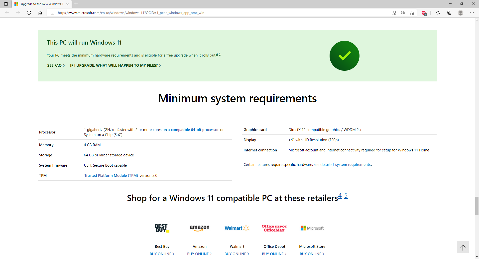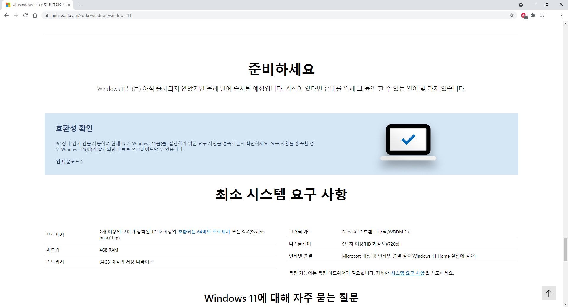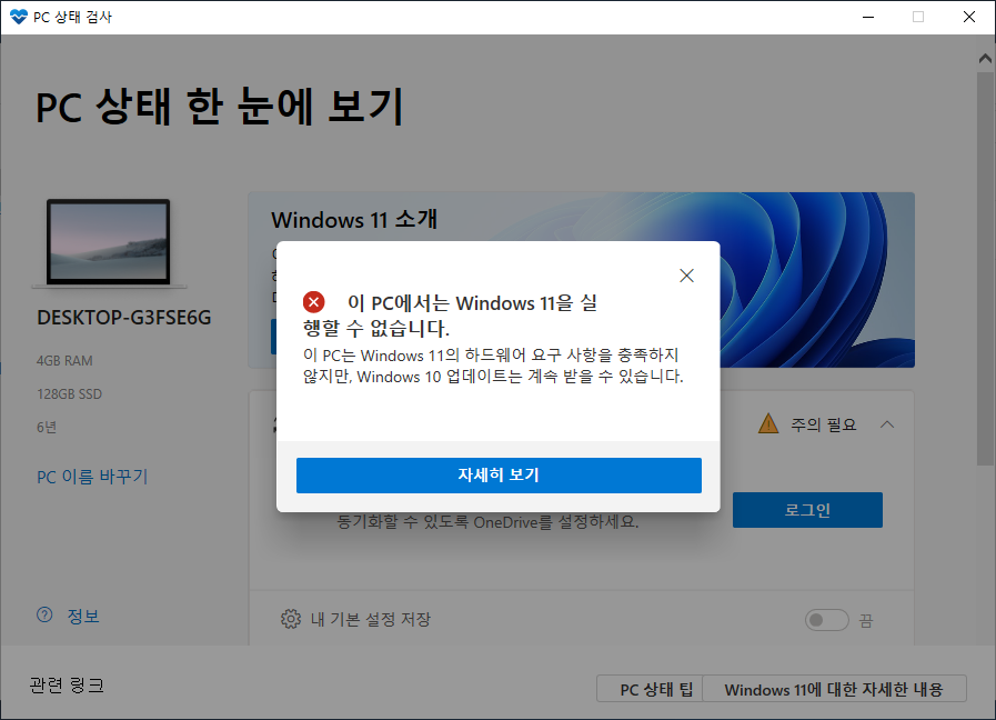 자세히 보기를 누르면 윈도우 11 소개 페이지에서 이 컴퓨터는 윈도우 11을 돌릴 수 있습니다 화면이 뜨게 됩니다.