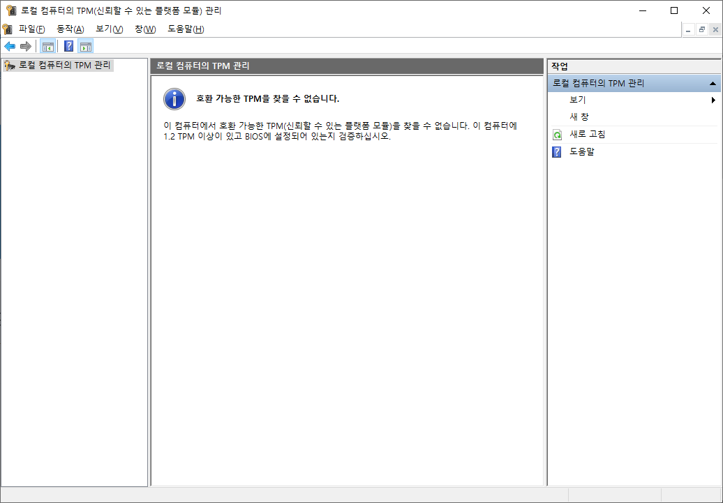 TPM을 사용하고 있지 않다면 위와 같은 화면이 뜨게 됩니다.