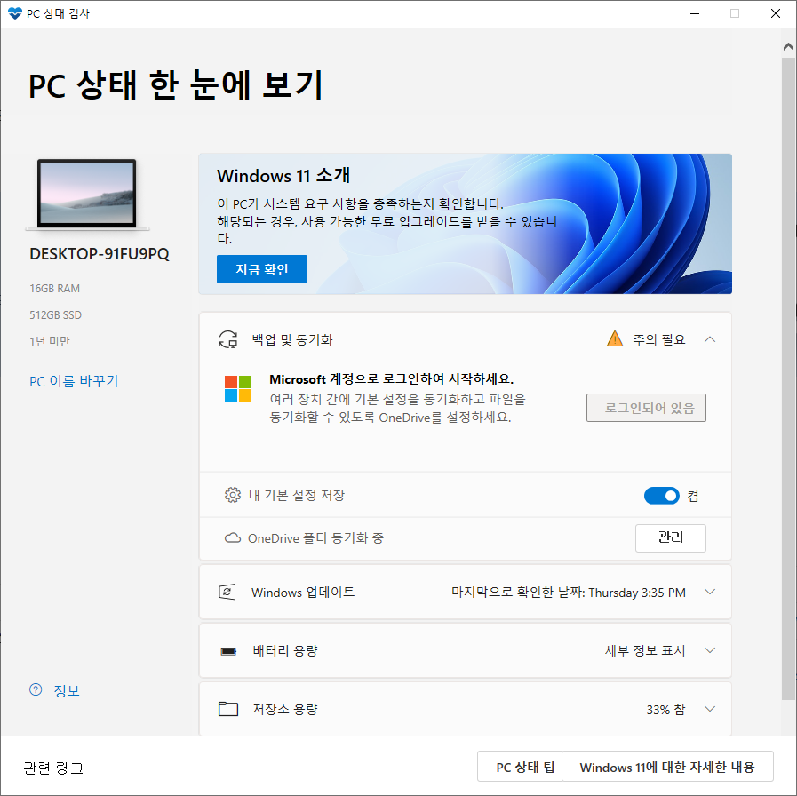 PC 상태 한눈에 보기가 뜨는데 여기서 윈도우 11 소개 부분의 지금 확인 버튼을 눌러줍니다.