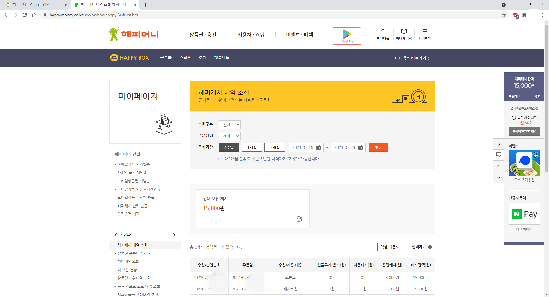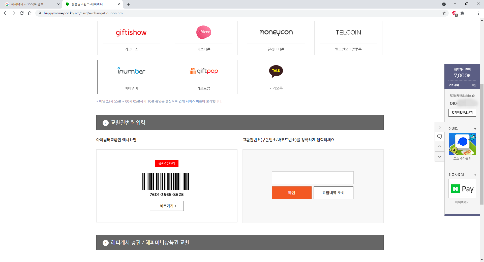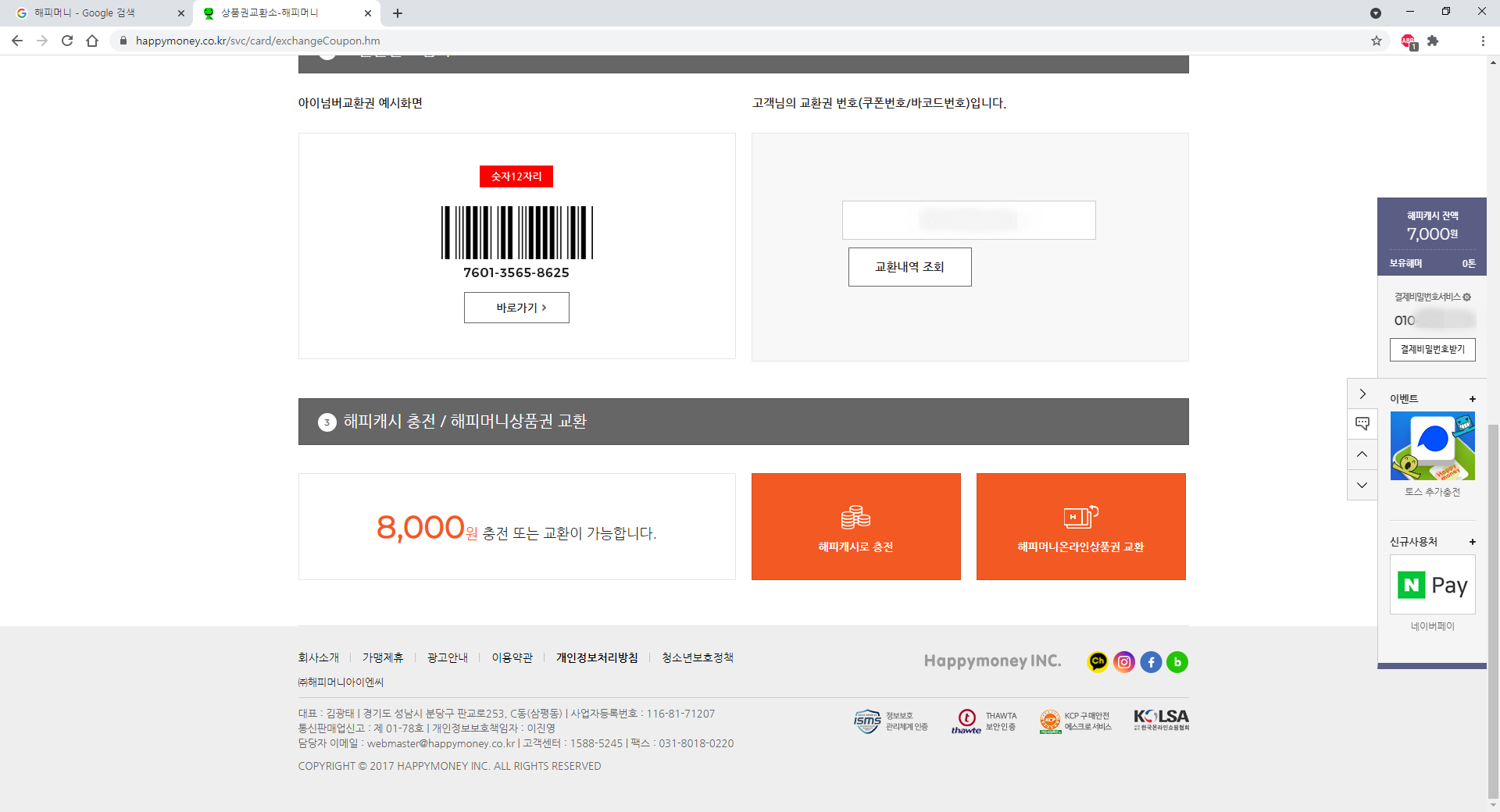 해피머니는 다른 데서도 사용이 가능한데 대표적으로 네이버에서도 사용이 가능합니다.