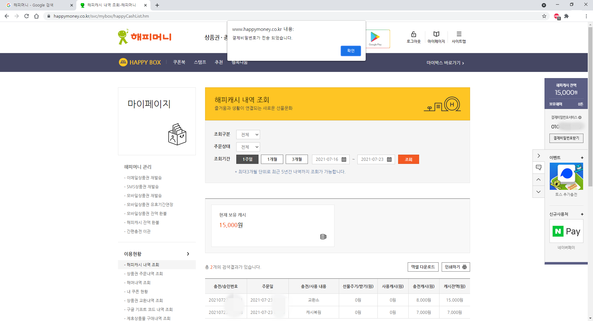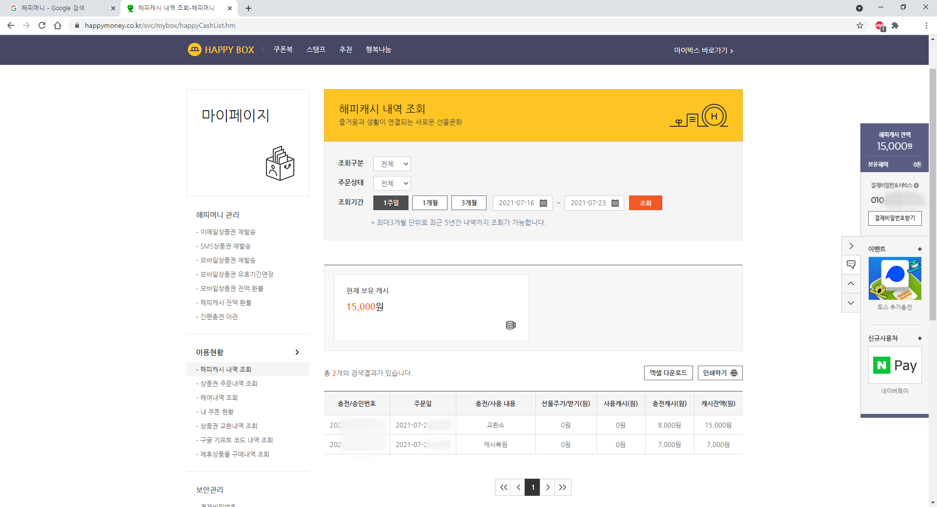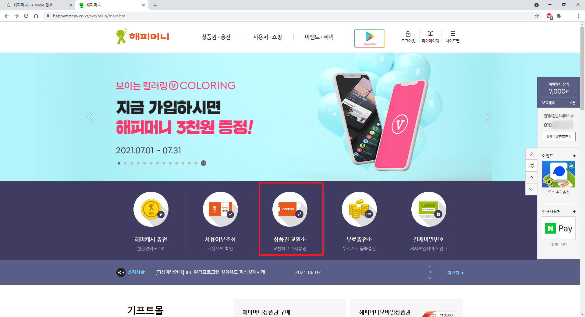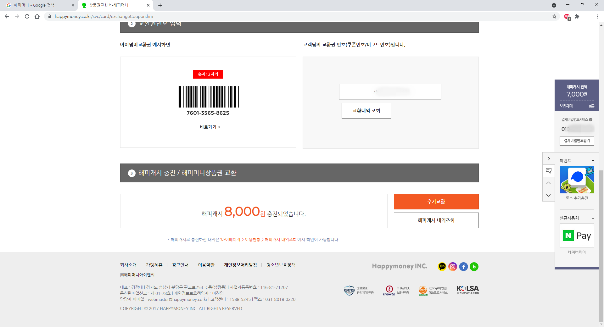 해피머니는 다른 데서도 사용이 가능한데 대표적으로 네이버에서도 사용이 가능합니다.