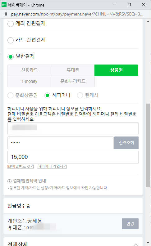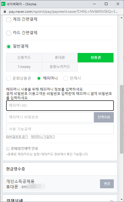 네이버 페이에서 일반 결제 -> 상품권 -> 해피머니를 선택합니다.