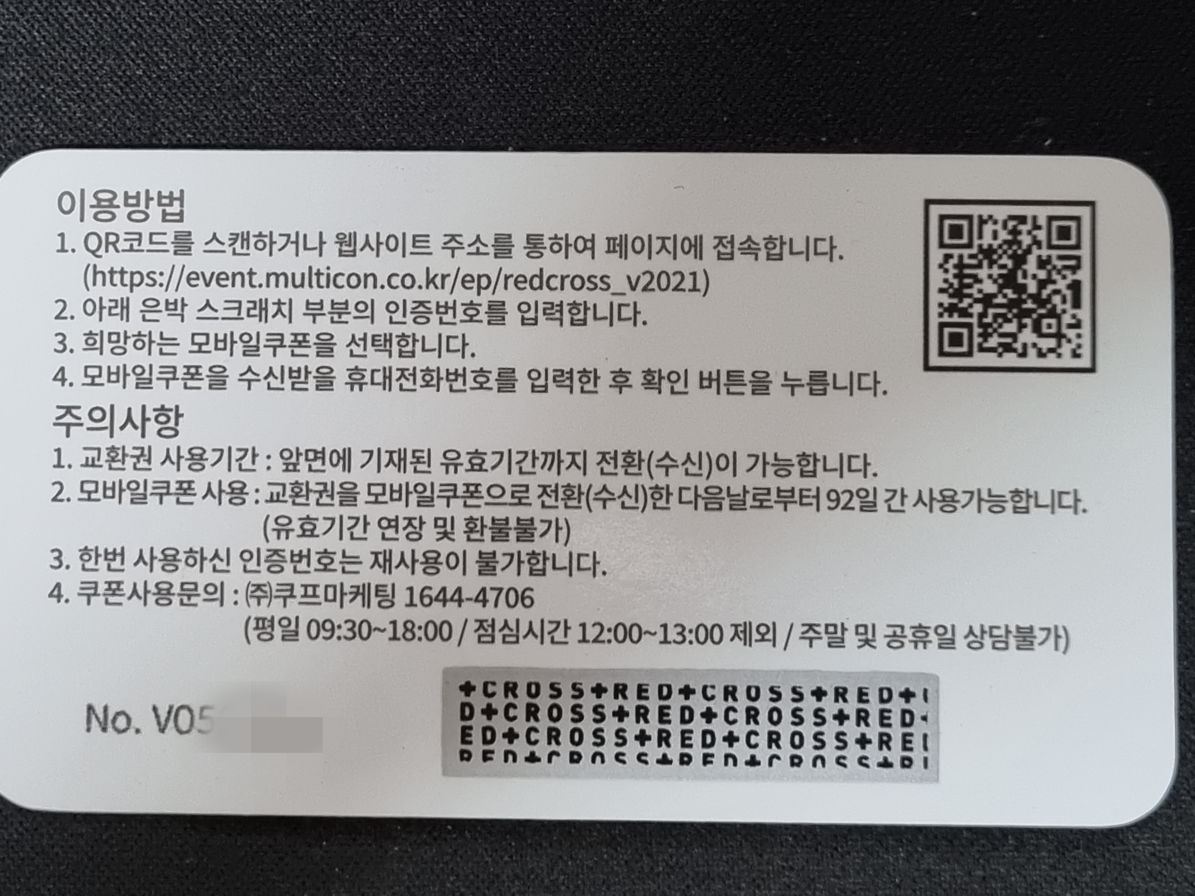 쿠폰 번호는 받은 쿠폰 뒷면 아래에 은색으로 칠해져 있는 부분(글자로 RED CROSS가 적혀있음)을 긁어내면 숫자가 나오는데 이 숫자를 입력하면 됩니다. 그 이후 보안번호와 휴대폰 번호를 입력하고 동의 후 수령하시면 됩니다.