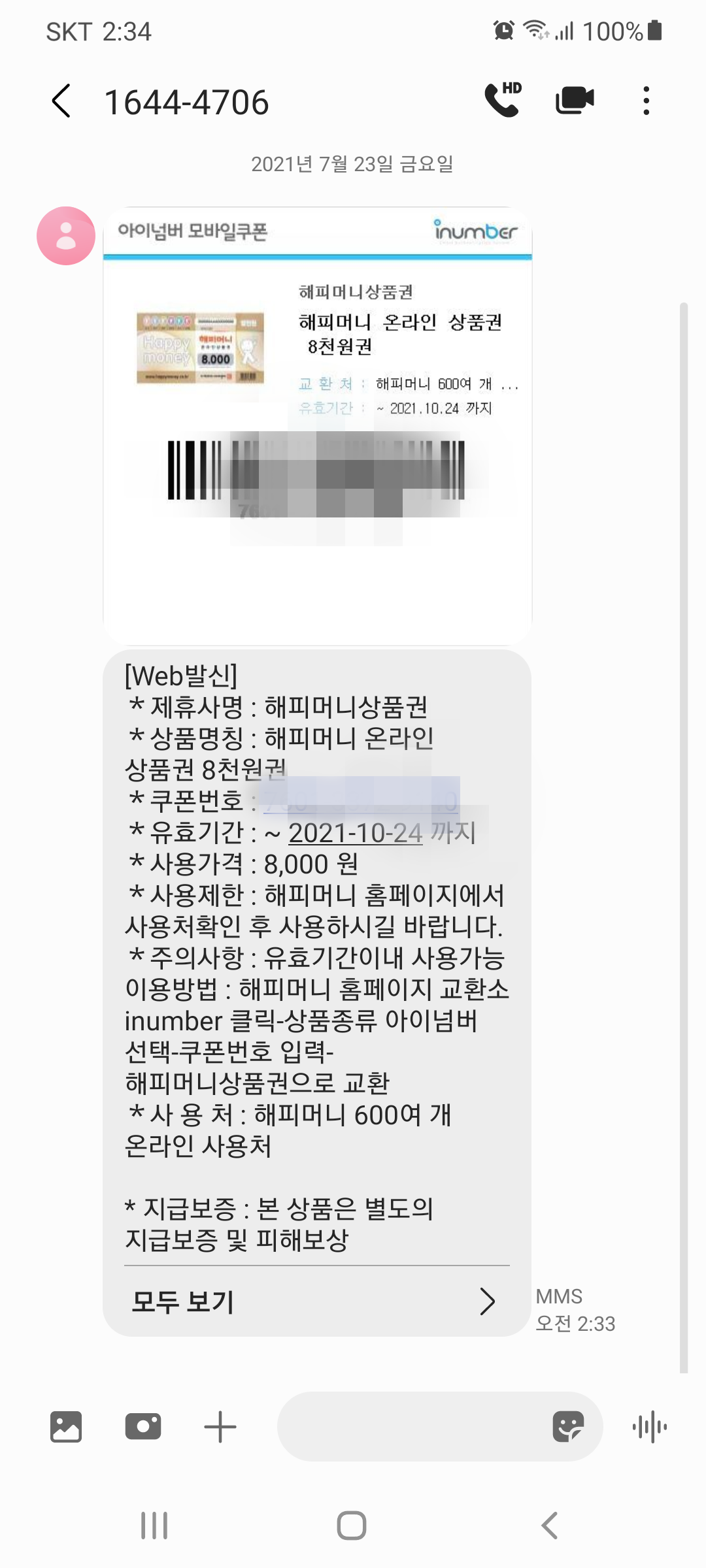 아래로 스크롤을 내리면 모바일 쿠폰을 선택 가능한데 해피머니 상품권 혹은 북 앤 라이프 상품권이 있습니다. 여기서 저는 해피머니를 선택하였습니다.