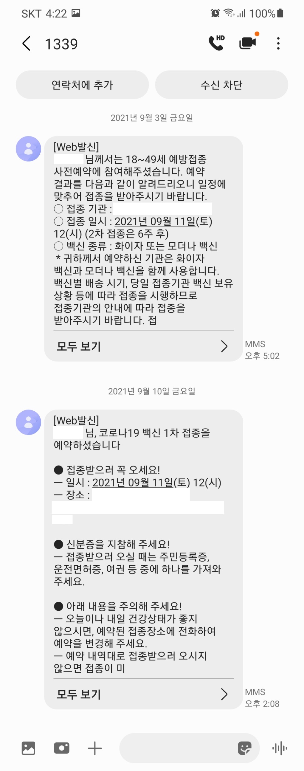 백신 예약이나 재난지원금 지급 등으로 정부기관에서 문자를 보내는 경우가 많이 생겼습니다. 따라서 이를 이용해서 사기꾼들이 사기를 치는 경우가 뉴스에 보도될 정도로 많은데 문자를 받았을 때 해당 문자에서 내 이름이 있으며 백신 접종이면 장소와 날짜가 내가 예약했던 장소와 시간이 맞는지 확인해 보고 맞다면 그 문자는 정부기관에서 보낸 것이 맞을 가능성이 높습니다. 일반적으로 사기를 치는 사람은 무차별로 문자를 보내므로 내 휴대폰의 정보가 이전에 빠져나간 것이 아닌 이상 예약 확인하기 또는 접종 확인하기 등의 내용만 들어있을 수밖에 없습니다.