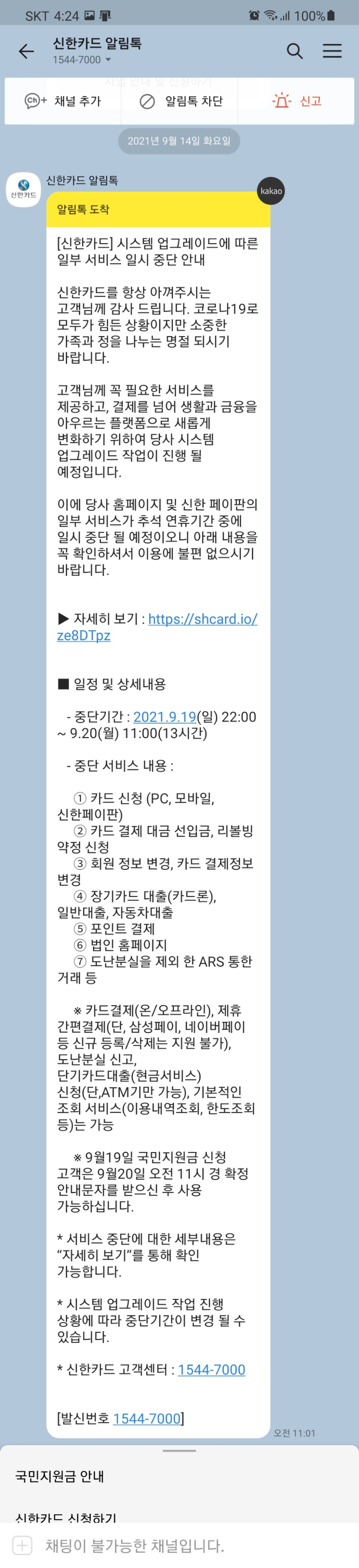 그리고 또한 신한카드 알림 톡의 경우에는 1544-7000의 전화번호가 기입되어있는데