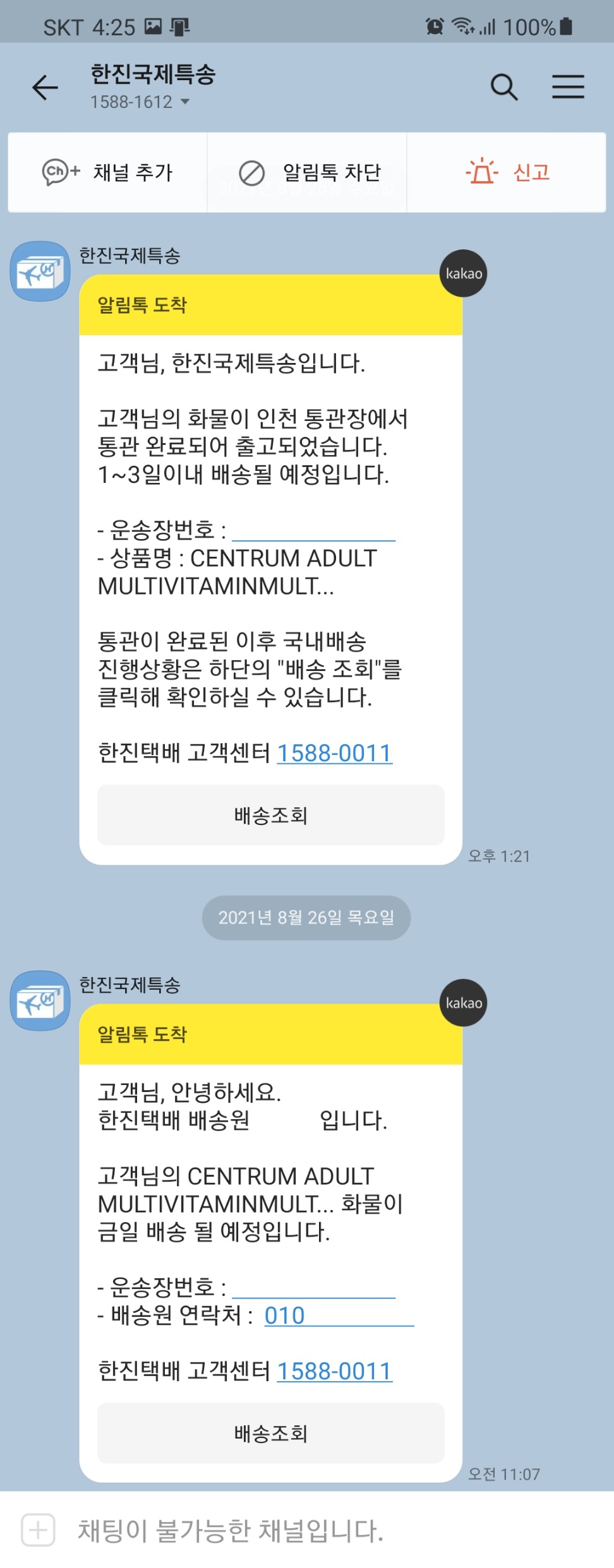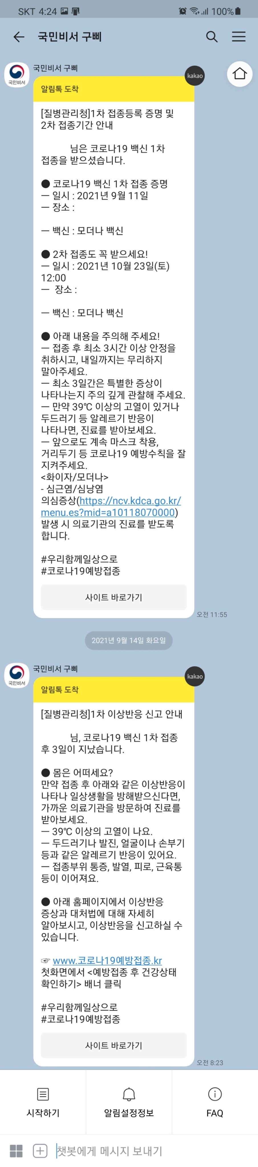 해당 메시지는 예방접종과 택배 배송 문자인데 오른쪽 위에 보면 카카오 마크가 붙어있게 됩니다. 이전의 내용과 함께 카카오 인증 마크도 같이 확인하시는 것이 좋습니다.