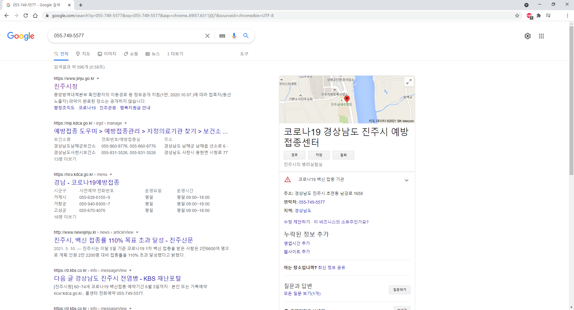 그리고 문자메시지를 보낸 전화번호를 구글에 검색하여보면 예방접종센터 전화번호가 뜨는 것을 알 수 있습니다.