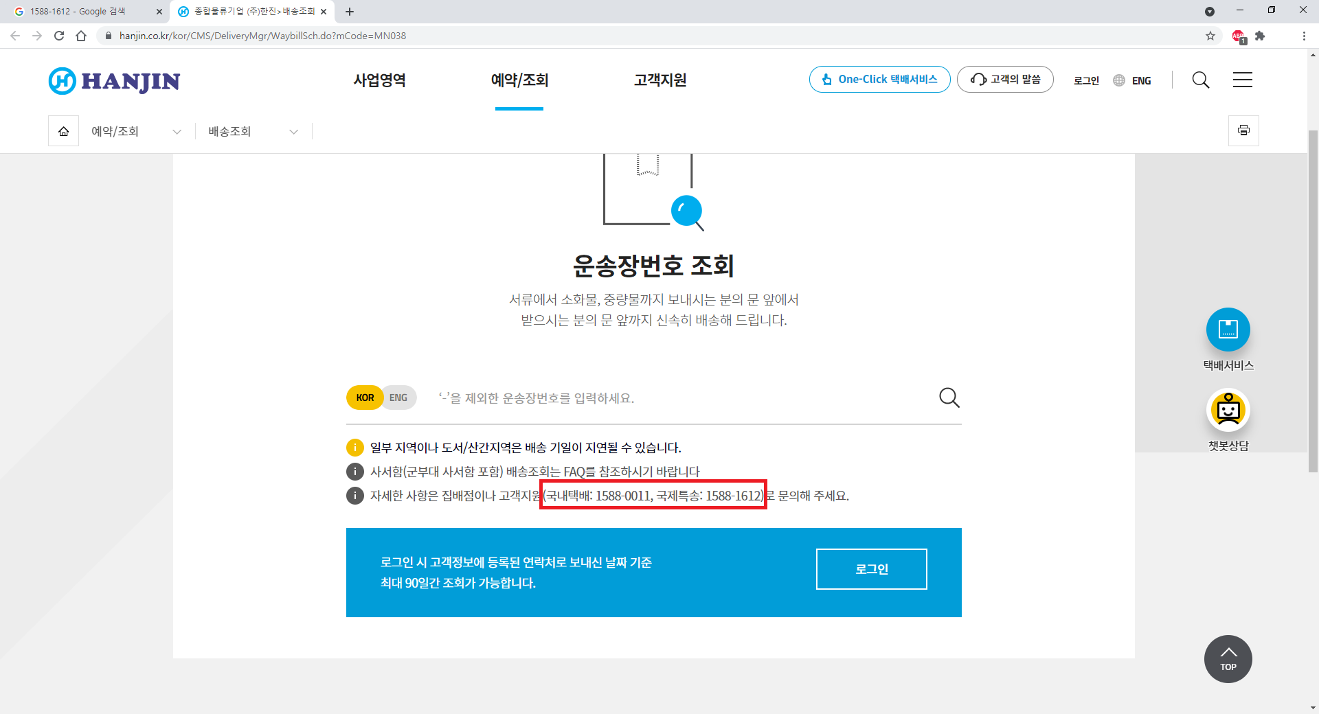 한진택배 고객지원 전화번호임을 알 수 있습니다.