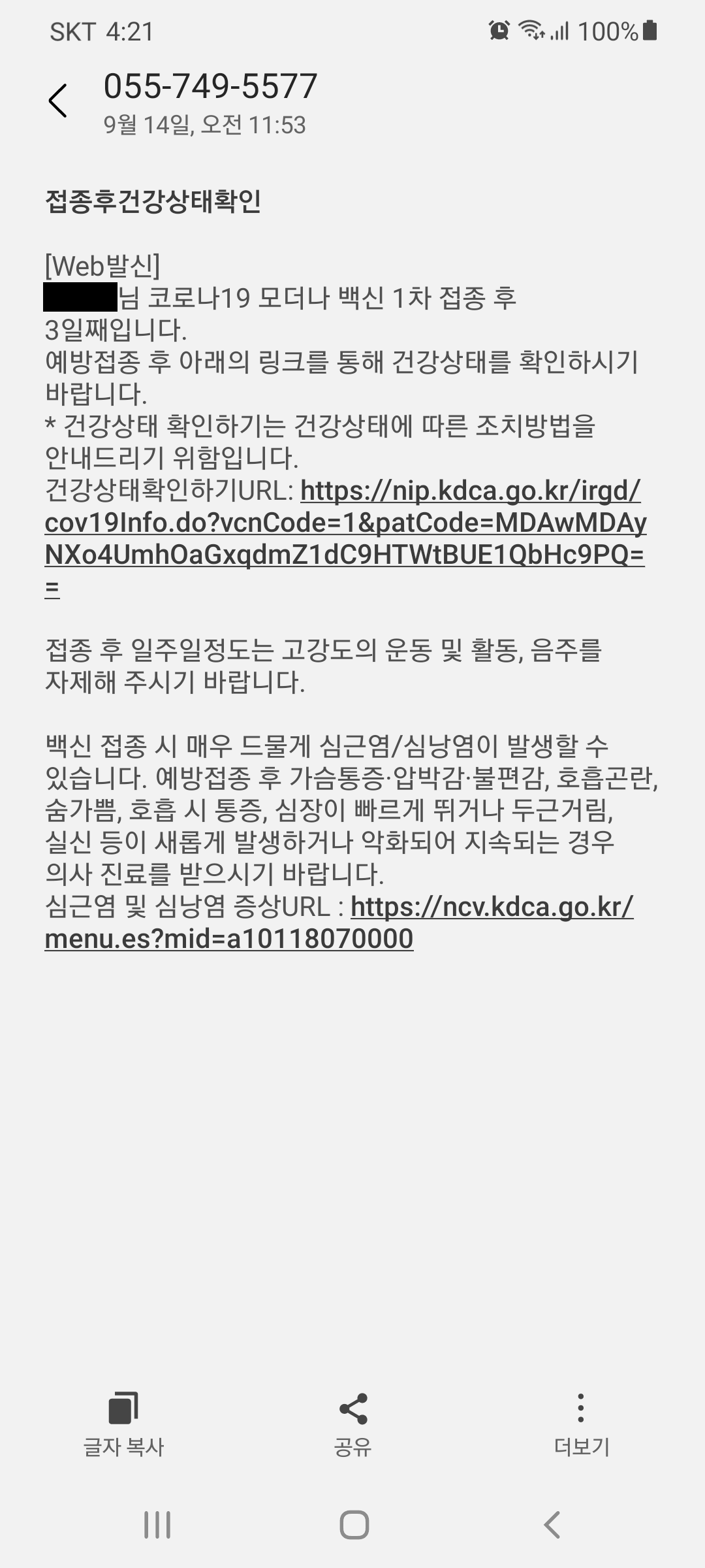 해당 문자는 예방접종 후 건강 확인을 위해 온 문자메시지입니다. 여기 링크를 확인해 보면 ncv.kdca.go.kr, nip.kdca.go.kr 이 포함되어있는 것을 확인할 수 있으며 go는 정부기관만 사용 가능하기 때문에 어느 정도 신뢰성이 있다고 볼 수 있습니다. 그리고 [Web발신] 뒤에 본인의 이름이 적혀있는 상태로 신뢰성이 추가로 있다고 볼 수 있습니다. 참고로 ncv.kdca.go.kr와 nip.kdca.go.kr 둘 다 예방접종 예약 사이트로 질병관리청에서 운영하는 사이트입니다. 다만 전자는 코로나19 백신 예방접종 전용이며 후자는 모든 예방접종 전담 사이트입니다.