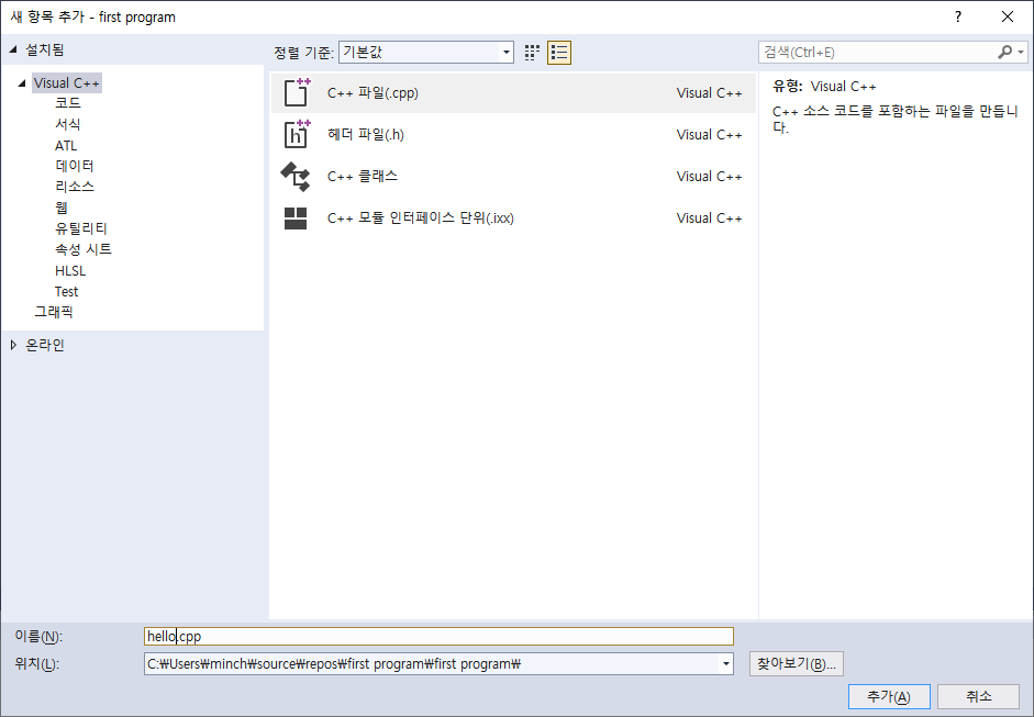 새 항목 추가에서 C++ 파일을 누른 다음 파일 이름을 아무렇게나 지정한 후 추가 버튼을 눌러 파일을 추가합니다.