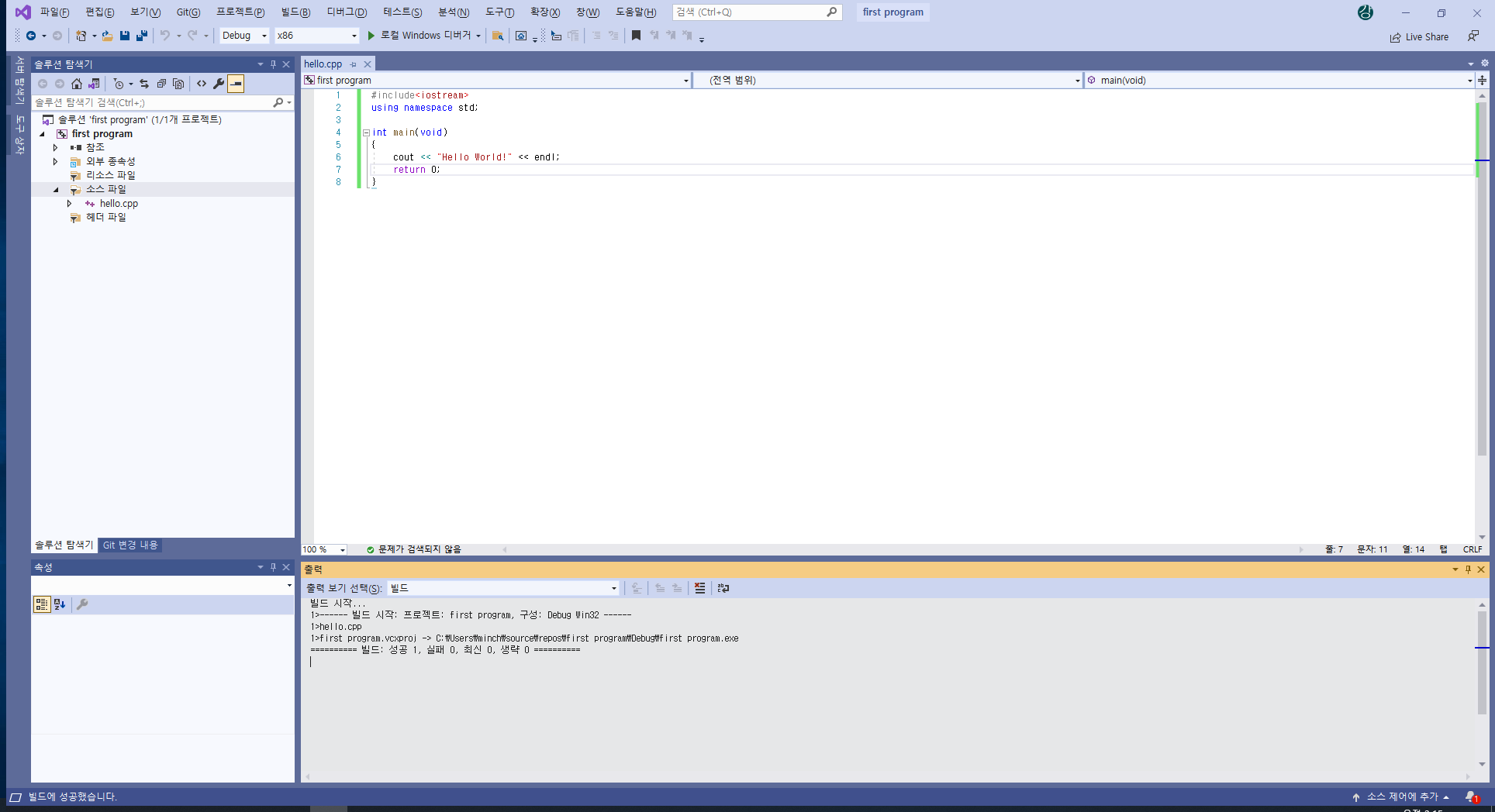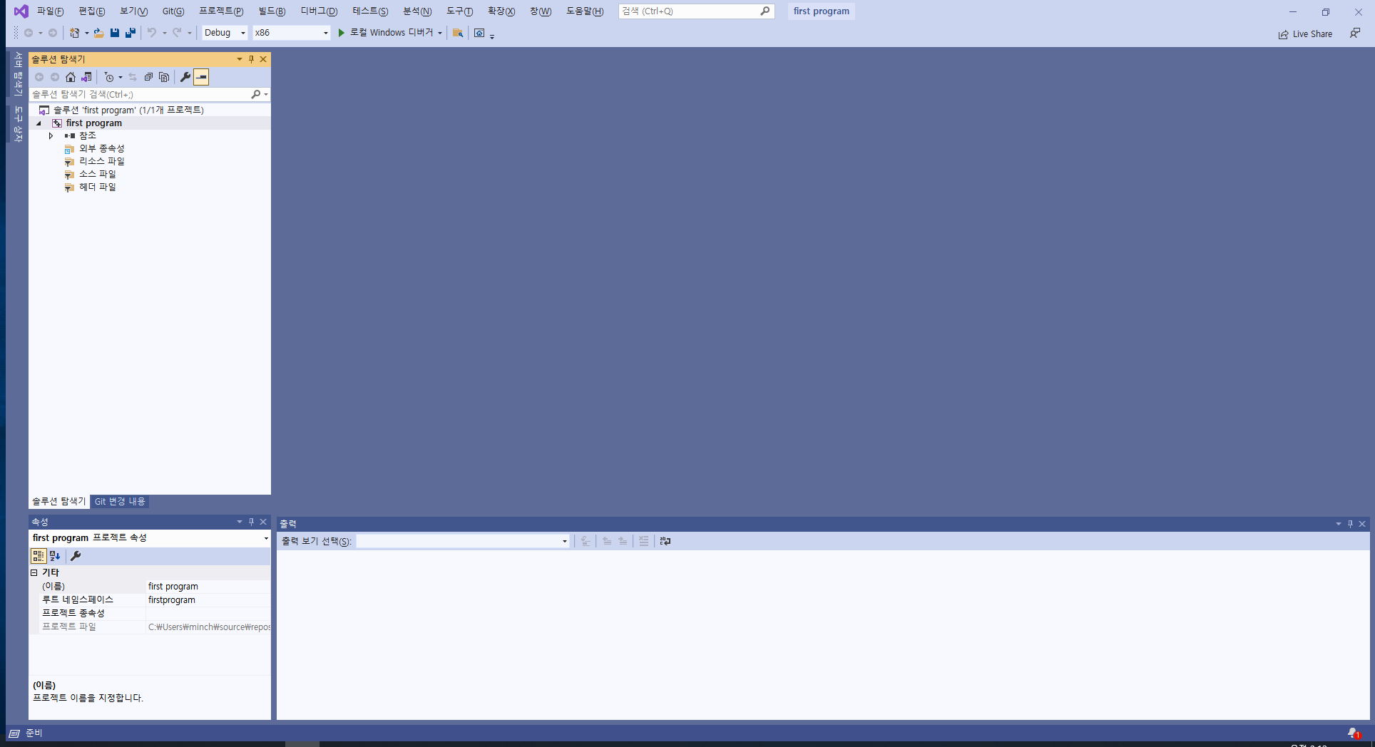 프로젝트가 완성되면 위와 같은 화면이 형성되지는 않습니다. 저는 예전에 사용하던 레이아웃이 편하여 솔루션 탐색기와 속성 탭을 왼쪽에 붙여놓아 이런 레이아웃 배치가 이루어진 것이며 현재 버전에서 레이아웃이 모두 오른쪽에 있다면 정상적으로 만들어진 것입니다.
