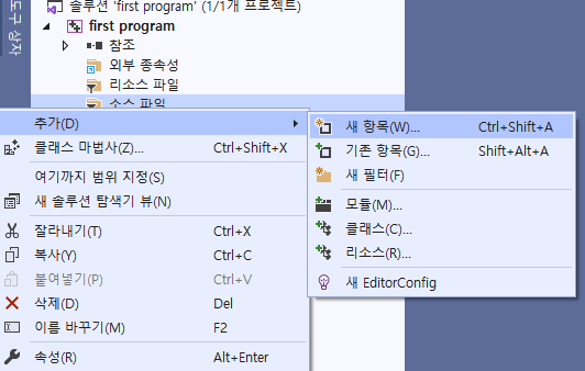 솔루션 탐색기에서 소스파일 폴더를 오른쪽 마우스 클릭해서 추가 -> 새 항목 순서로 눌러줍니다.
