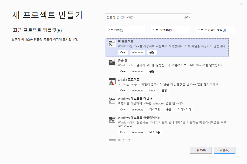 Visual Studio 2019 기준으로 프로젝트를 만드는 방법으로는 다음과 같습니다.
