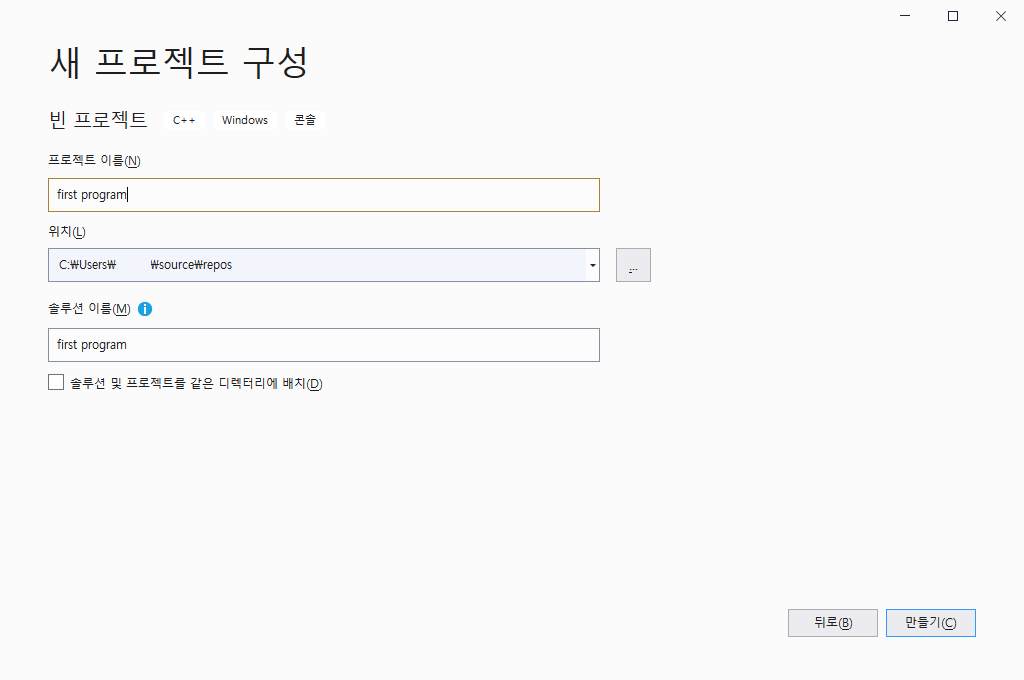 새 프로젝트 구성으로 넘어가면 프로젝트 이름을 지정하고 위치를 지정한 다음(원하면 기본으로 놔두어도 됨) 아래의 만들기 버튼을 눌러 창을 종료시킵니다.